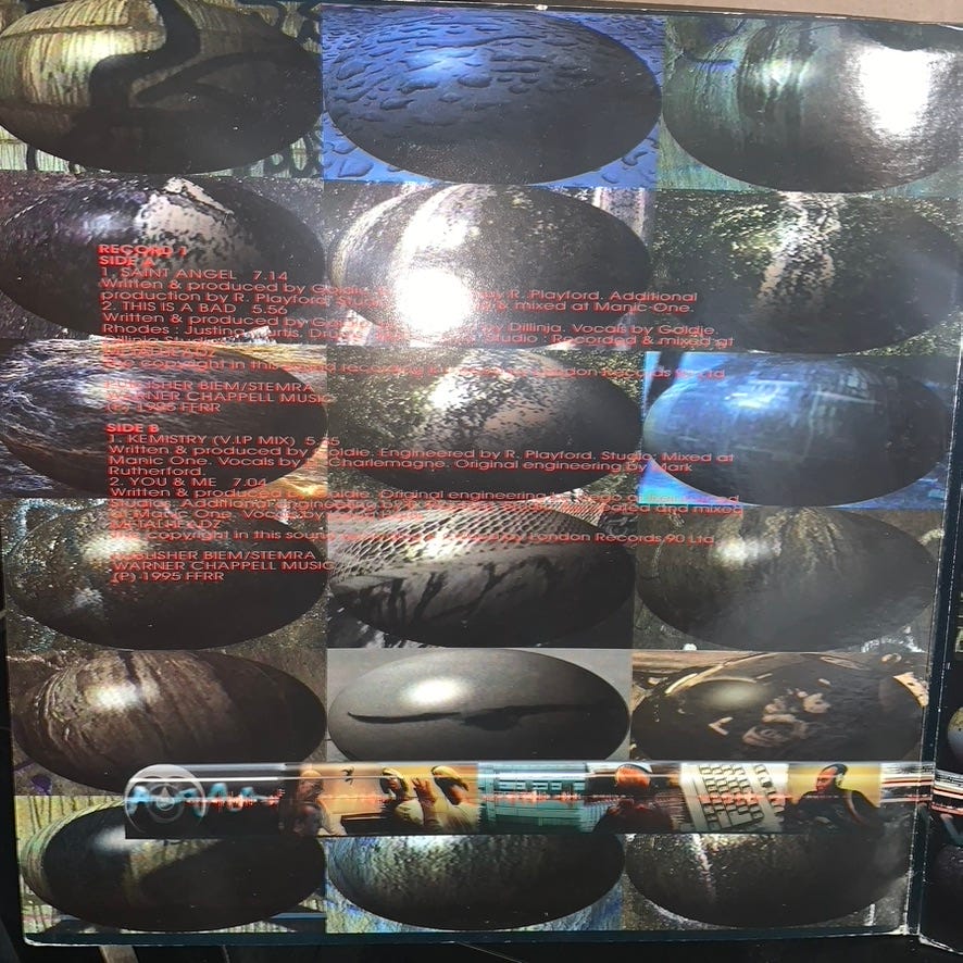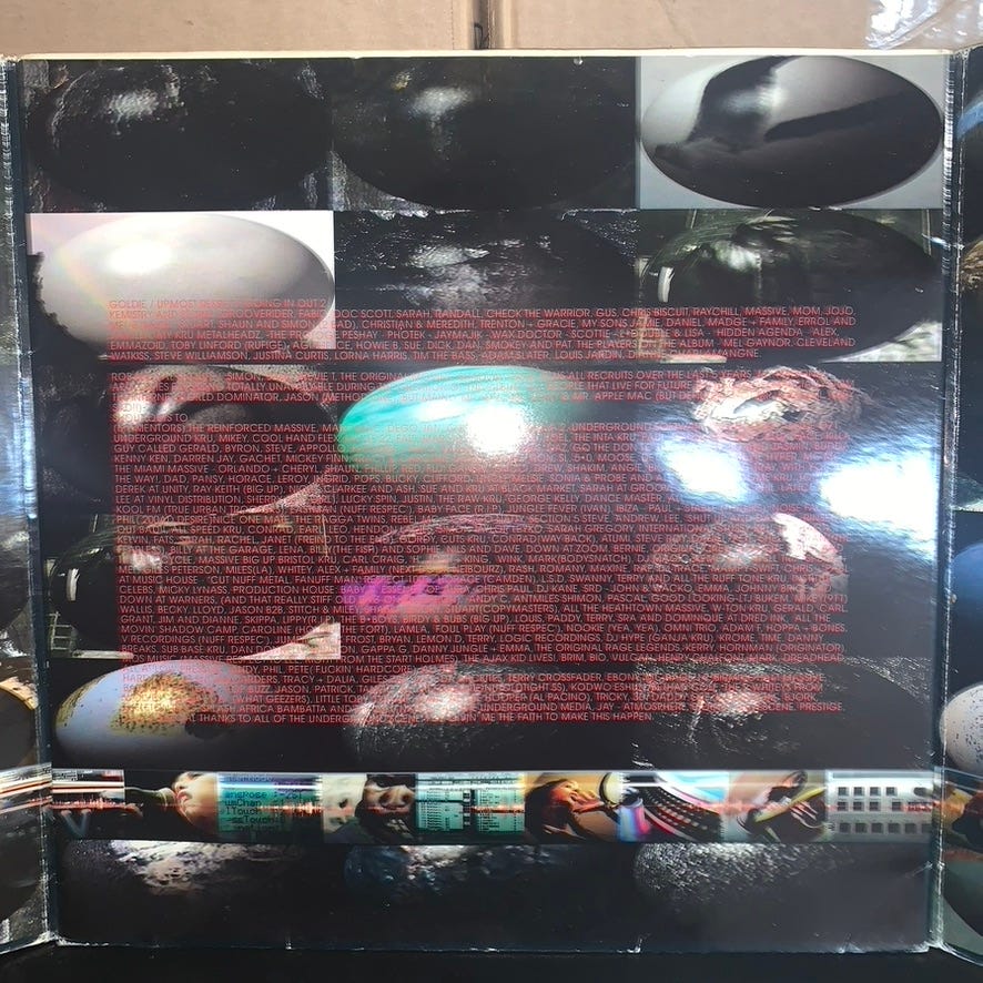 This is actually the first dnb release I ever bought, first on CD, then eventually I found a vinyl copy. I had just graduated from high school, I was already buying a lot of music on CD, almost ever week something new. I was a fan of Bjork, and had read in SPIN Magazine about her then boyfriend, a highly touted underground music artist: Goldie. I was in to car audio systems at the time, he made a style of music called drum & bass, and I liked bass. I bought the CD at Tower Records, this time the Annapolis location.
